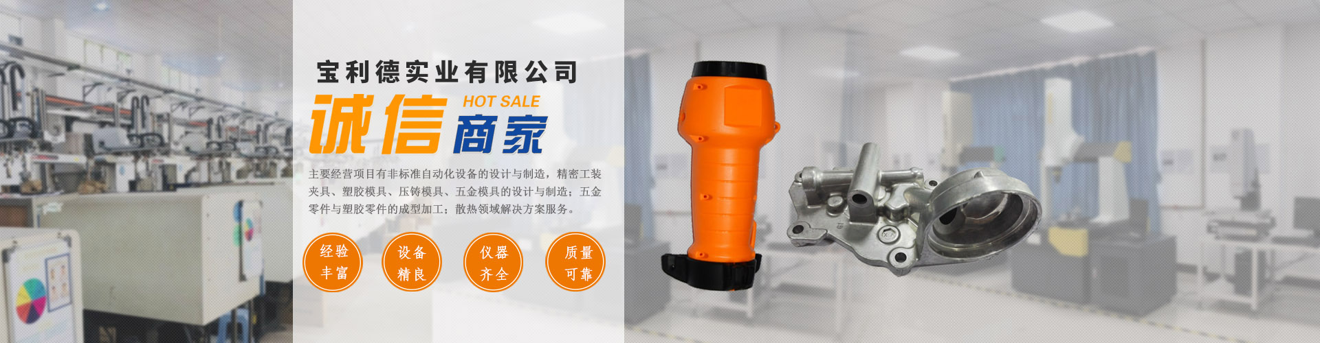 東莞市宝利德実業有限会社」は10000平方メートルの面積を占めて,主な経営業務は非標自動化設備の設計と製造、精密クランプ治具、治具、検具、金属金型、プラスチック金型、ダイキャスト金型の設計と加工です。金属部品とプラスチック部品の、プレス加工などです。
